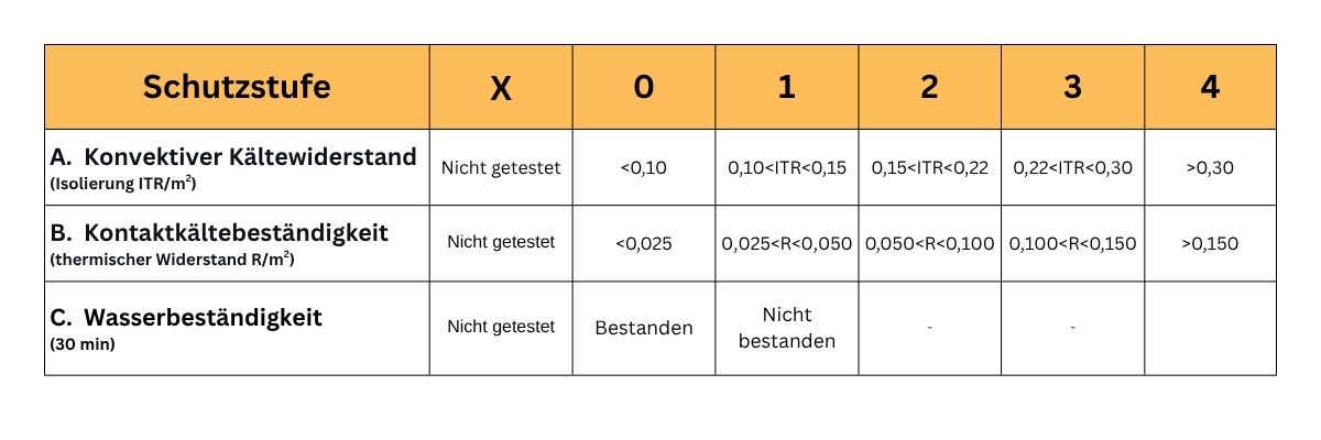 Die Norm verwendet eine Notenskala von 0 bis 4, wobei höhere Zahlen für bessere Leistungen stehen. Hier finden Sie eine Aufschlüsselung der von der EN 511 bewerteten Aspekte: